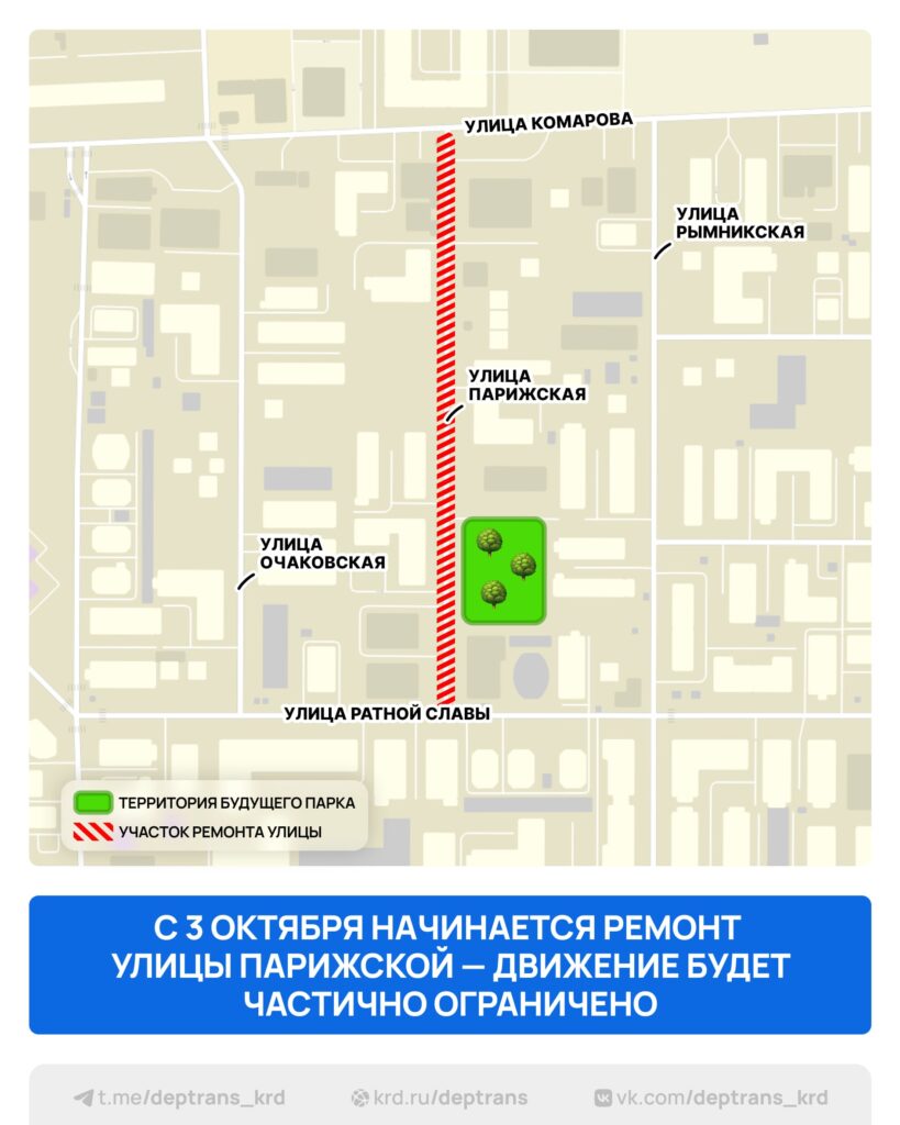С 3 октября на улице Парижской в Краснодаре начнется ремонт дорожного покрытия. Работы будут проводиться на участке от улицы Комарова до улицы Ратной Славы и должны быть завершены до 15 ноября 2025 года.
